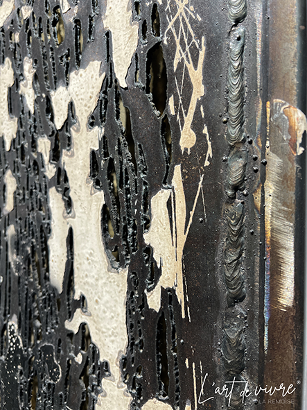 Le métal qui sert de support et de matériau à sa création est récupéré dans une démarche d’upcycling et de revalorisation. Les plaques de métal peuvent parfois dormir plusieurs années dans l’atelier avant qu’Antoni décide d’en choisir une correspondant à son projet pour la travailler et la transformer.