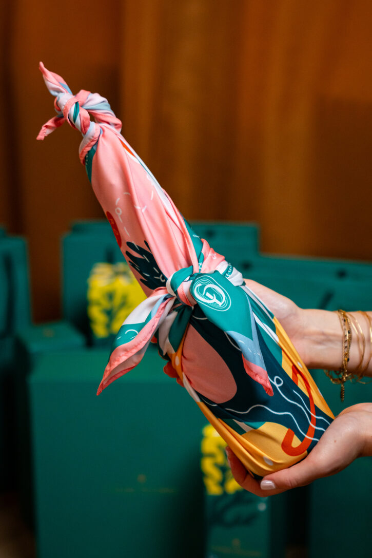 Délicatement emballée à la main dans la méthode du furoshiki (art japonais traditionnel de pliage et de nouage de tissu) Léonie Iconic se pare des couleurs éclatantes de cette collaboration à travers un carré de tissu au design inspiré de l’oeuvre Equilibrium. Écrin, foulard, ruban, tableau… au-delà de l’esthétisme, ce tissu propose également une approche plus responsable du packaging en offrant de nombreuses solutions de réutilisations.