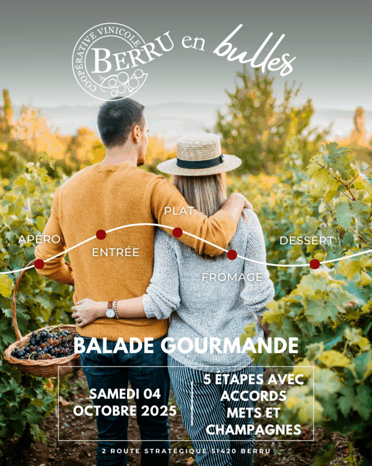 Une balade conviviale de 7 km au cœur des vignes, ponctuée de 5 étapes gourmandes (apéritif, entrée, plat, fromage et dessert), chacune accompagnée d’un accord avec une cuvée de Champagne de la Coopérative Vinicole de Berru.