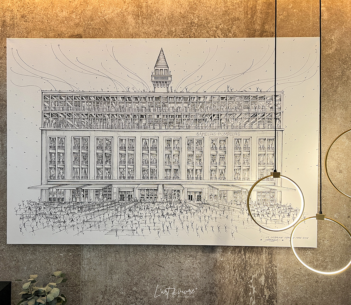 Exposée dans le lobby de l’Hôtel & Spa, la toile représente la façade iconique de La Caserne Chanzy. À travers une interprétation contemporaine et graphique, l’artiste propose une relecture sensible de ce monument du patrimoine rémois, mettant en lumière un siècle d’histoire, de transformations et de renaissance.