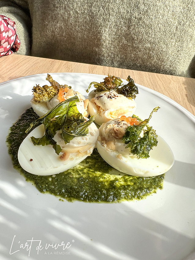 Nous avons opté pour des œufs mayo, c’est la grande tendance du moment mais agrémentés d’éclats de noisettes, chips de chou kale et œufs de truite.
