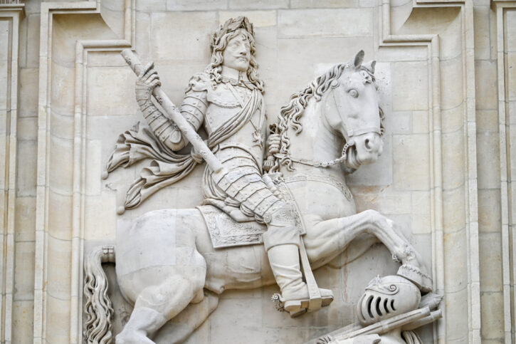 La statue équestre monumentale située au dessus de la porte d’entrée représente LOUIS XIII ( 1601-1643) qui était donc le roi au moment de la construction de l’édifice ( en 1627).