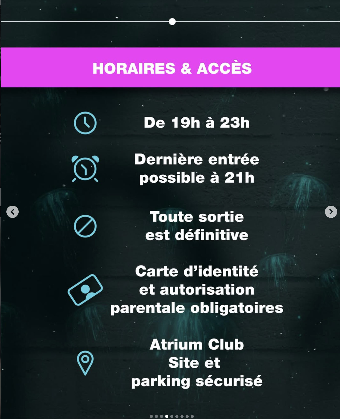 Il offre à ce jeune public une première expérience festive et responsable, adaptée à son âge et à ses attentes musicales. Les ados y trouveront une soirée dont les horaires et le contenu sont appropriés, le tout encadré par des professionnels de l’Atrium.