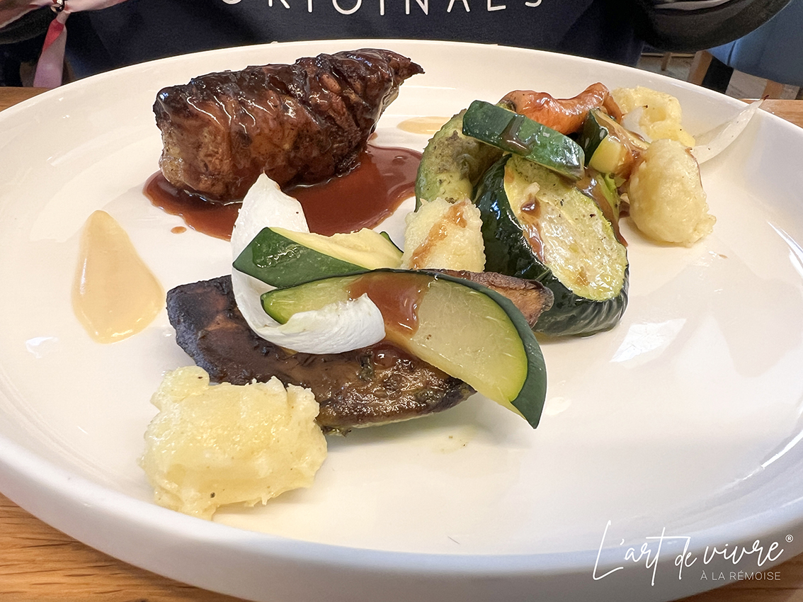 Un cœur de ris de veau poelé et jus réduit pour mon ami Thomas que je remercie pour l’invitation et un Onglet de veau, patate douce pousse d’épinard et oignon blanc.