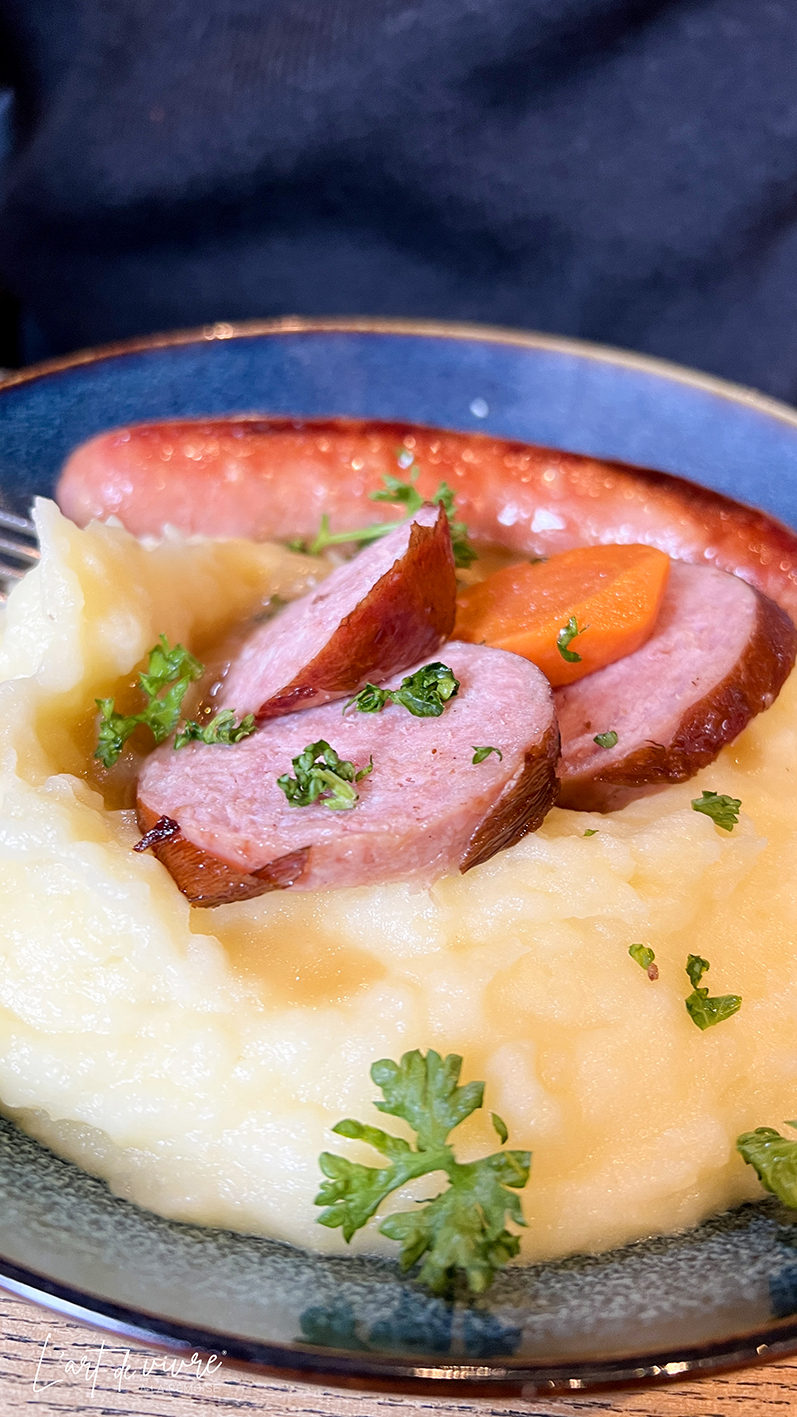 Le menu du jour est à 19,50 € (plat / dessert). Ce midi, c’était ( double) saucisse ( Toulouse/Morteau), purée et mousse au chocolat. Les assiettes sont très copieuses et bien réalisées.