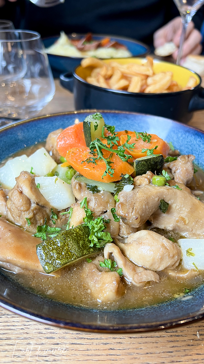 À la carte, le sauté de volaille au cidre, accompagné d’excellentes frites fraîches. L’accompagnement est au choix : poêlée de légumes, gratin dauphinois, pâtes… mais quand il y a des frites, je ne peux pas résister !