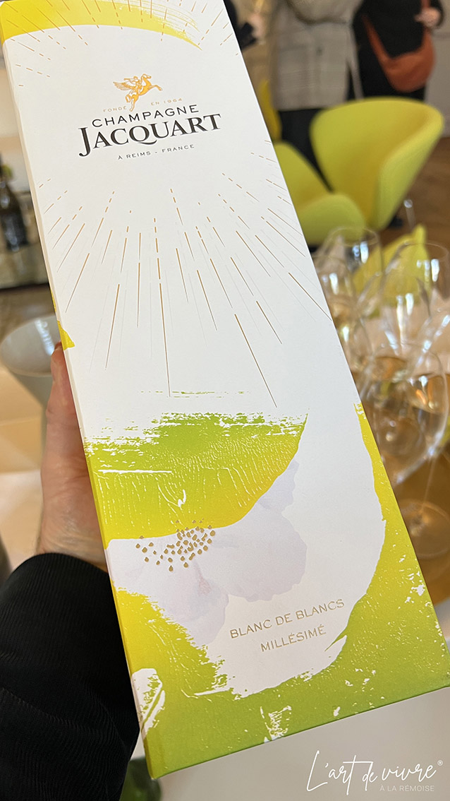 Pour présenter ce petit bijou millésimé, la Maison Jacquart a fait appel à Odyssée Khorsandian, une artiste qui connaît bien Reims, où elle a étudié à l’ESAD. Peintre, graphiste et plasticienne, elle a mobilisé plusieurs techniques afin de proposer un coffret d’une grande finesse, qui habille parfaitement cette cuvée.