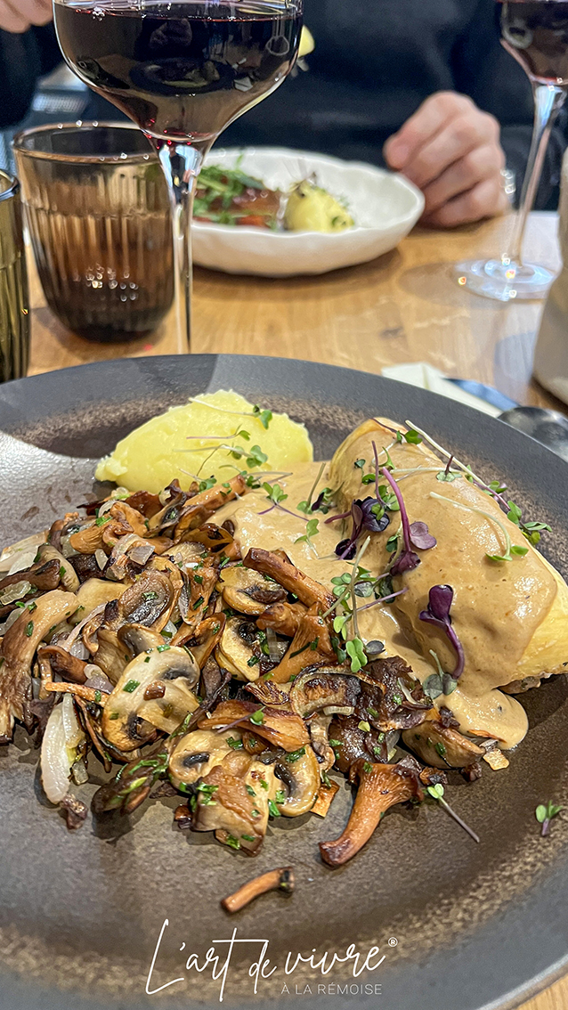En plat, un paleron et sa purée grand-mère, sauce paprika, et une ballotine de volaille et sa poêlée de champignons.