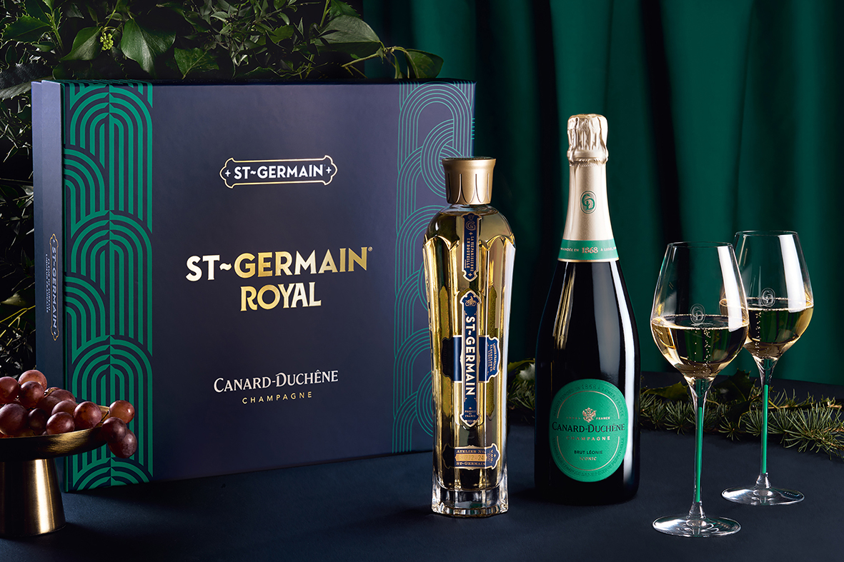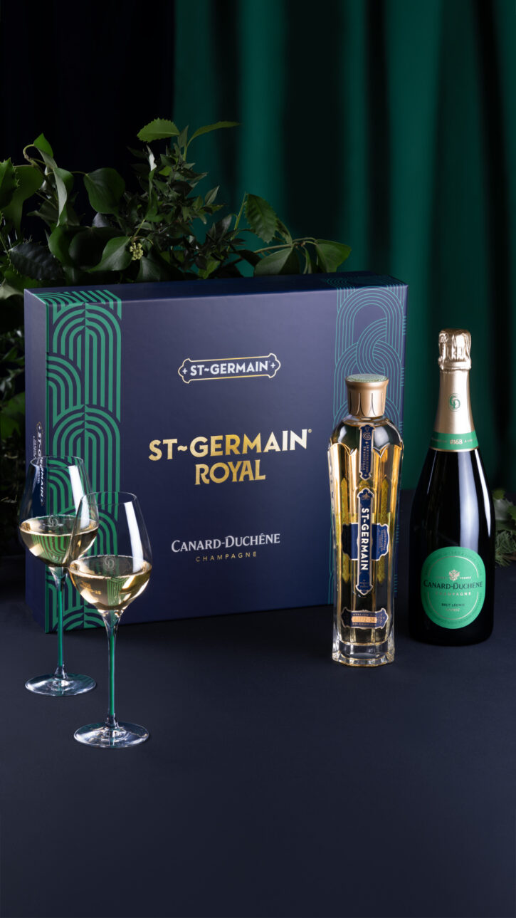 Le coffret St-Germain Royal comprend une bouteille de St- Germain® (50cl), une bouteille de Champagne Canard- Duchêne Cuvée Léonie Iconic (75cl) et deux coupes de Champagne siglées Canard-Duchêne.